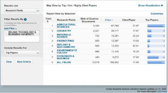據科睿唯安(Clarivate)2025年7月發布的最新一期《基本科學指標數據庫》(Essential Science Indicators,簡稱ESI)統計數據顯示,北京工商大學經濟學與商學(Economics & Business)學科首次進入ESI全球排名前1%,實現學科建設歷史性突破,標志著我校經濟學與商學進入國際高水平學科行列。我校目前已進入ESI前1%的7個學科具體表現如下: