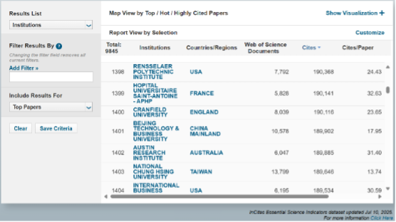 ESI數據庫共分22個學科領域,是基于科睿唯安Web of Science(SCIE/SSCI)所收錄的全球12000多種學術期刊的1000多萬條文獻記錄而建立的計量分析數據庫。以10年為1個周期對全球所有大學及科研機構的SCI、SSCI論文及其引用情況等進行統計和比較,按論文被引次數排列在前1%的學科方可進入ESI學科排行,同時給出排名進入全球前1%的大學及科研機構的排序,每2個月更新公布1次。ESI數據庫通過論文數、論文被引頻次、論文篇均被引頻次、高被引論文、熱點論文和前沿論文等6大指標,從各個角度對國家/地區科研水平、機構學術聲譽、科學家學術影響力以及期刊學術水平進行全面衡量,已成為當今世界范圍內普遍用以評價高校、學術機構、國家/地區國際學術水平及影響力的重要評價指標工具之一。