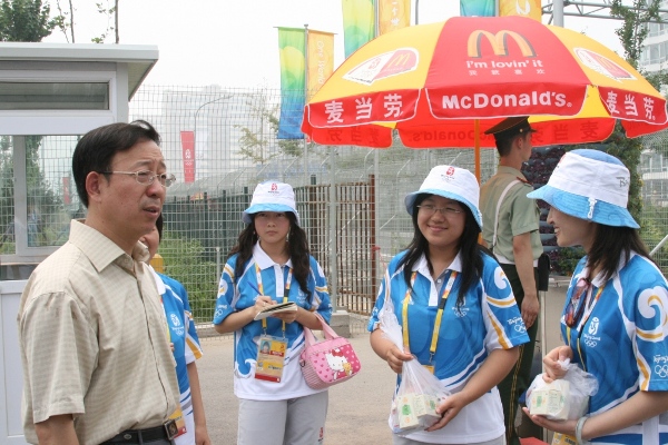 隨后,孫寶國一行依次來到奧運村的三號門、四號門和一號門看望正在烈日下工作的志愿者們。當聽說志愿者們每天必須在太陽下工作8個小時左右,而這其中有半數以上是女生,孫寶國特別強調要志愿者注意保持身體健康,保障基本的飲水和休息,還特別叮囑志愿者要服用鹽水,最好不要使用藥物。在三號門,孫寶國了解到帶隊老師楊帥能夠在完成自身工作之余,與志愿者們一同在烈日下站崗,表示了由衷的贊賞。他還詢問了志愿者工作中存在的問題,并跟志愿者們說要向一起工作的交警們學習。在歡迎中心和訪客中心,志愿者們邀請孫寶國一行與大家合影留念,在了解到這些志愿者主要任務是語言服務后,他表示這是一個鍛煉自己溝通能力的好機會,希望大家能夠借此機會多向他人學習。
