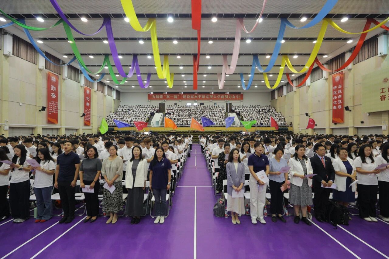 黨委書記沈千帆,黨委副書記、校長郭建華為新生代表佩戴校徽,全體新生同時起立,將校徽鄭重佩戴于胸前。學校為每位研究生新生印發校歌曲譜,“求真、立德、勤奮、創新”的校訓精神,將在2025級學子的身上得到新的傳承,煥發新的生機,匯聚新的時代力量。