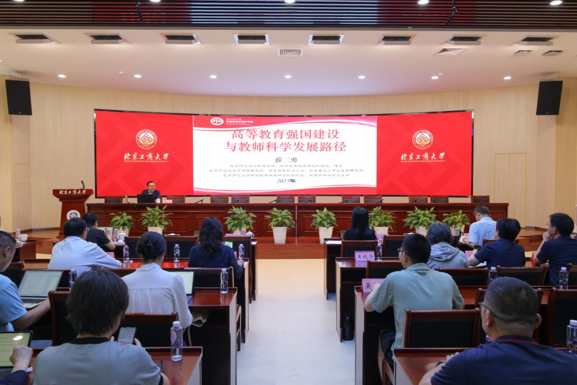 薛二勇教授圍繞主題,運用詳實的數據與案例,深入剖析了高等教育強國的核心內涵與評價維度。他從理念、制度、機制及監測體系等多維度,系統解讀了高等教育強國的建設路徑。薛教授特別聚焦教師發展的科學路徑,強調教師是建設教育強國的“第一資源”和核心力量。他結合前沿研究與優秀教師成長案例,深刻闡述了新時代高校教師應具備的素養結構,以及在師德涵養、教學能力、科研創新等方面實現高質量發展的具體策略,為與會教師指明了方向。他勉勵大家深刻認識肩負的時代重任,將個人發展融入國家教育事業大局,勇于探索、持續精進,以教育家精神為引領,爭做“大先生”,為教育強國建設貢獻智慧與力量。