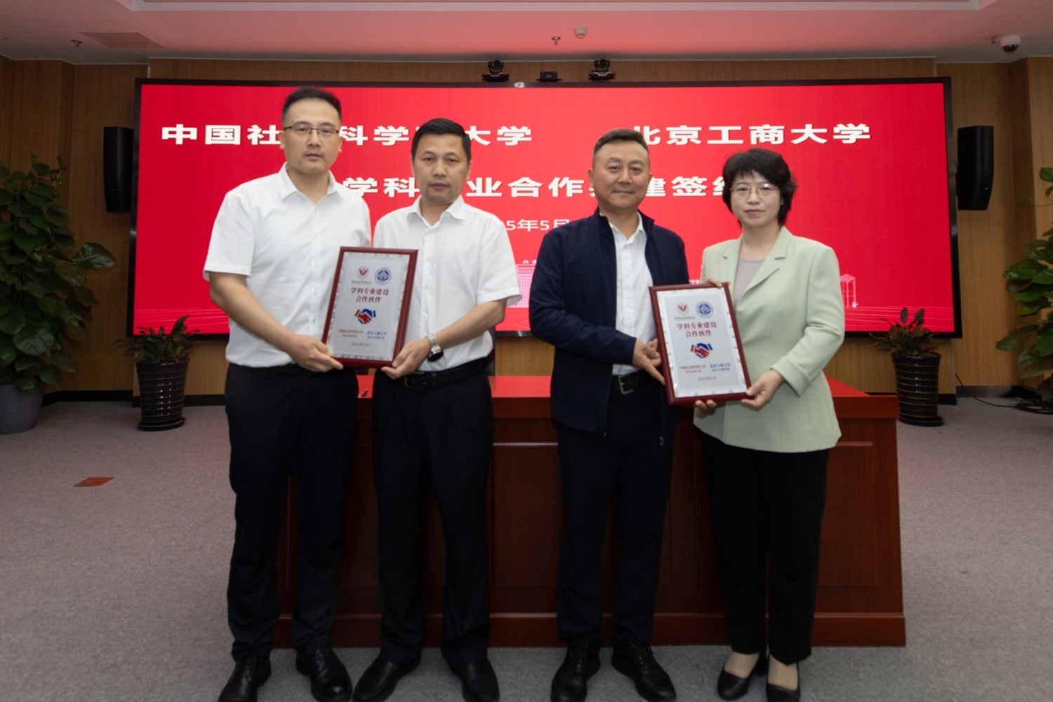 中國社會科學院大學新聞傳播學院院長杜智濤和我校語言與傳播學院院長王擎簽約;姜飛和寇紅江為雙方頒發簽約紀念牌。
