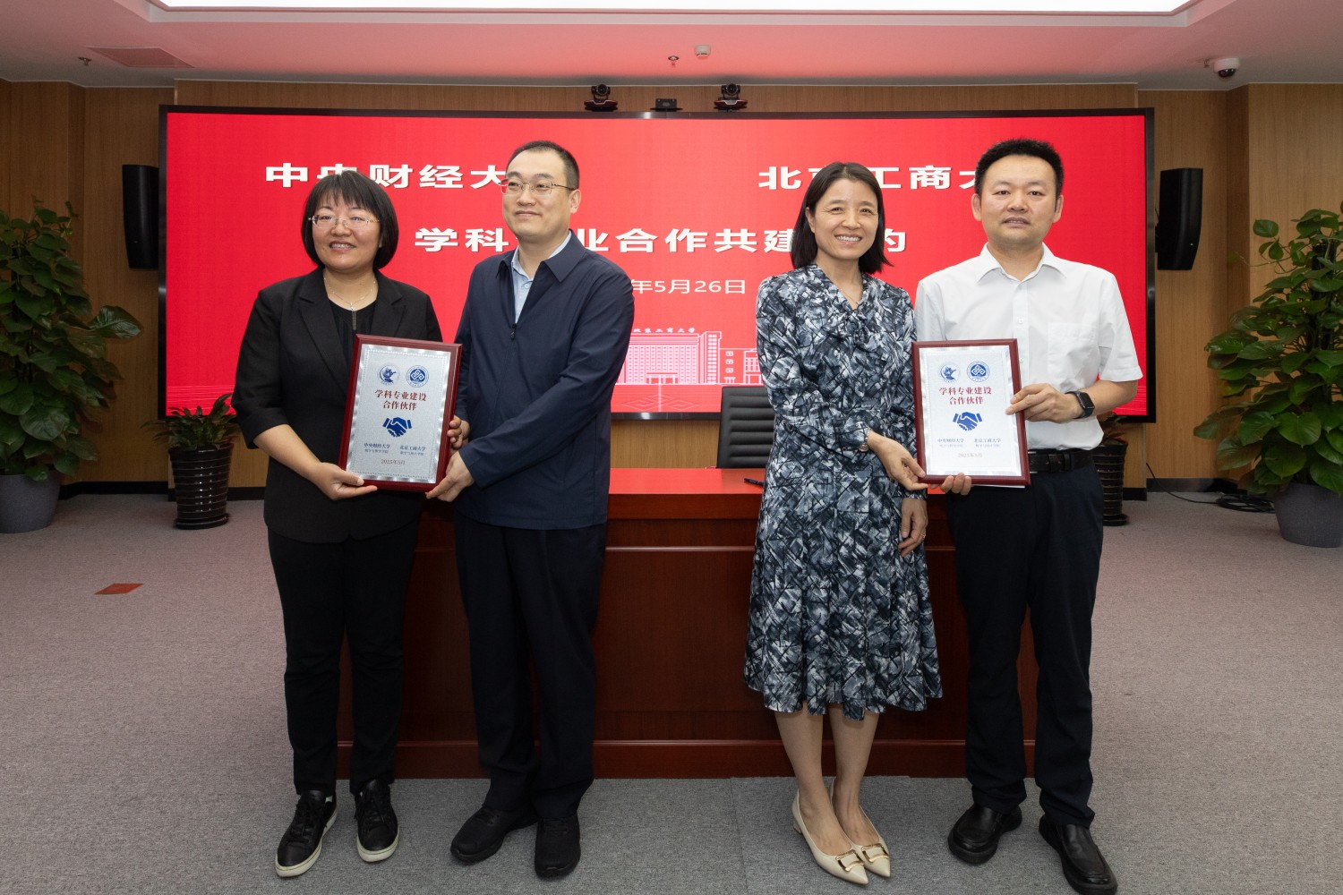 中央財經大學統計與數學學院院長賈尚暉和我校數學與統計學院黨委書記周艷杰簽約;李濤和劉艷楠為雙方頒發簽約紀念牌。