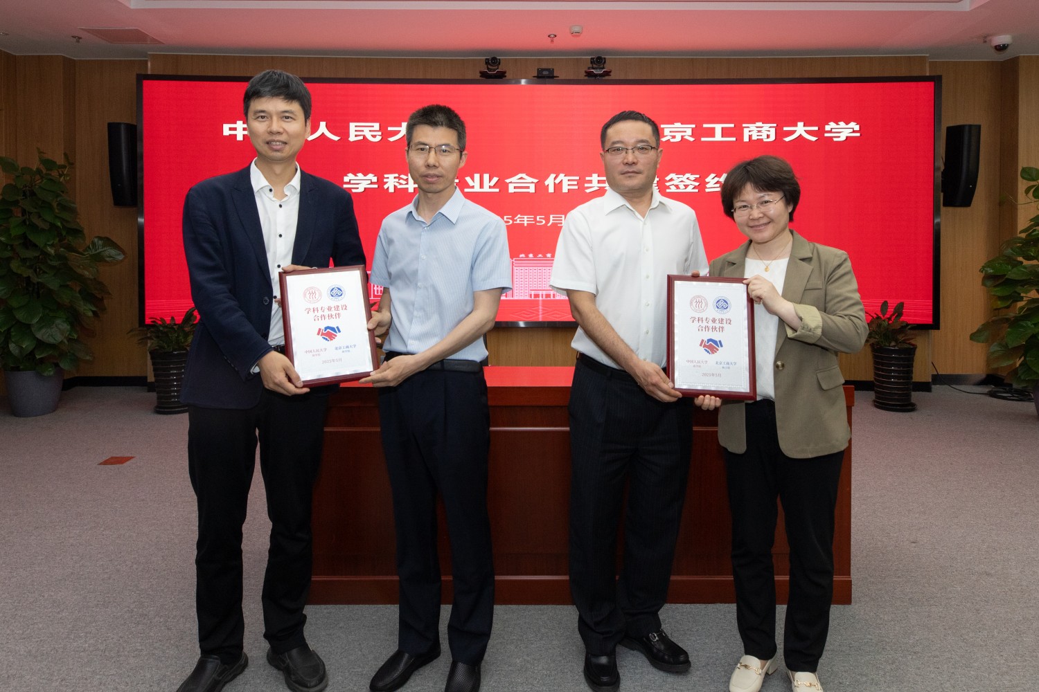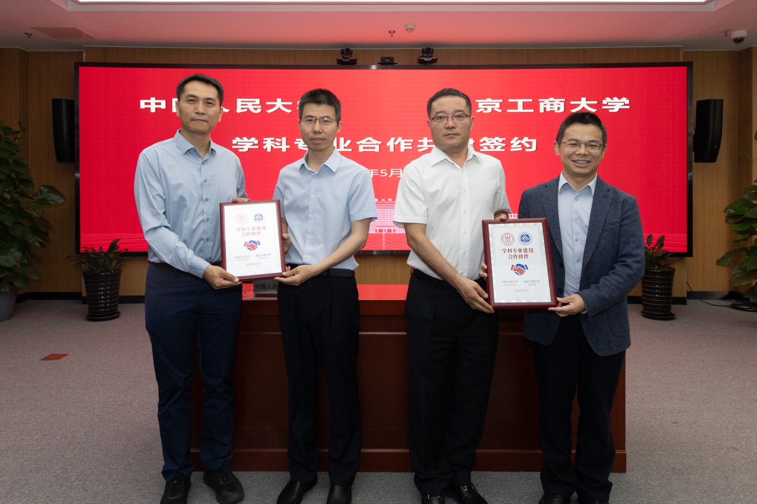 中國人民大學商學院院長易靖韜和我校商學院執行院長何玉潤簽約;支曉強和毛新述為雙方頒發簽約紀念牌。