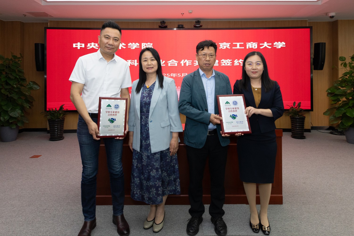 中央美術學院設計學院設計學院研究生部主任王選政和我校設計與藝術學院黨委書記王海偉簽約;潘承輝和宋曉欣為雙方頒發簽約紀念牌。