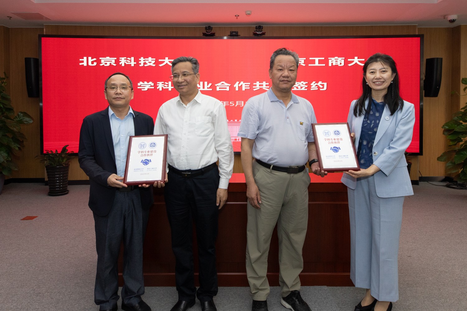 北京科技大學材料科學與工程學院黨委書記張秋曼和我校輕工科學與工程學院執行院長翁云宣簽約;彭慶紅和鄭文紅為雙方頒發簽約紀念牌。