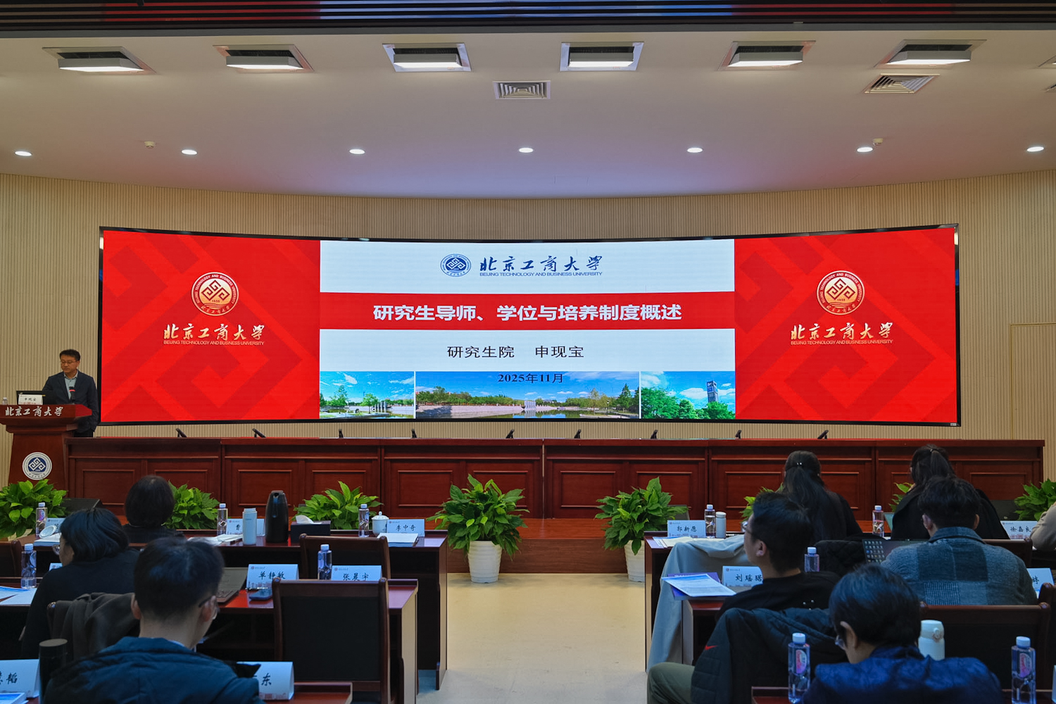 會上,郭建華向新晉研究生導(dǎo)師表示祝賀,并指出導(dǎo)師作為“研究生培養(yǎng)第一責(zé)任人”,肩負著培育培養(yǎng)高層次創(chuàng)新人才的重要使命,要恪守師道、以身垂范,落實好立德樹人根本任務(wù)。他闡釋了“工商一體化”發(fā)展理念,表示北京工商大學(xué)的“工商”不是一個詞,而是兩個獨立的字,承載著北京輕工業(yè)學(xué)院和北京商學(xué)院的基因印記與歷史榮耀。“工”與“商”不能孤立存在和發(fā)展,要以“技術(shù)賦能商業(yè)創(chuàng)新、商業(yè)驅(qū)動技術(shù)進步、數(shù)智助力供需適配”打破學(xué)科壁壘、深度融通,這是基于歷史積淀、又順應(yīng)時代要求的學(xué)校特色發(fā)展之路。他圍繞導(dǎo)師履職提出四點要求:一是以德立身。要將思想政治教育擺在首位,以言傳身教引導(dǎo)學(xué)生扣好學(xué)術(shù)生涯“第一粒扣子”,要將學(xué)術(shù)規(guī)范教育貫穿研究生培養(yǎng)始終,引導(dǎo)學(xué)生樹立正確的學(xué)術(shù)觀。二是以學(xué)立業(yè)。緊跟人工智能發(fā)展趨勢,主動學(xué)習(xí)新技術(shù)以打破傳統(tǒng)教學(xué)局限,培養(yǎng)學(xué)生自主學(xué)習(xí)與創(chuàng)新能力。三是以愛育人,踐行“供需適配”理念,結(jié)合學(xué)生個性特點、職業(yè)志向及社會需求與自身專長,制定個性化培養(yǎng)方案,避免照搬固有模式。四是以創(chuàng)爭先。要堅持以“工商一體化”發(fā)展理念為引領(lǐng),擁抱數(shù)字化變革,將AI融入教育科研,積極參與跨學(xué)科合作,依托學(xué)校發(fā)展戰(zhàn)略在細分領(lǐng)域打造特色優(yōu)勢。郭建華勉勵新晉導(dǎo)師要在提升自身科研能力的同時帶領(lǐng)學(xué)生站穩(wěn)學(xué)術(shù)立場、提升專業(yè)素養(yǎng),于育人與科研雙重實踐中把握機遇、實現(xiàn)價值,為學(xué)校研究生教育高質(zhì)量發(fā)展與國家高層次人才培養(yǎng)貢獻力量。