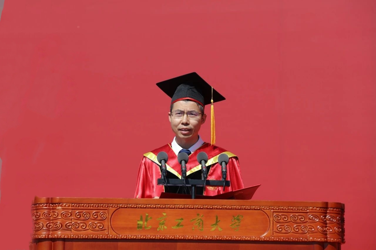 在即將踏上新征程之際,郭建華寄語(yǔ)畢業(yè)生們以“工商一體”的獨(dú)特基因,錨定航向、勇立潮頭:一是在時(shí)代變局中把穩(wěn)“定盤星”,做清醒的破局者。“工商一體化”不僅是北工商人的學(xué)科底色,更是大家破浪前行的獨(dú)特利器。希望大家將工科的系統(tǒng)性思維作為“導(dǎo)航儀”,將商科的動(dòng)態(tài)視野作為“雷達(dá)屏”,既能用科技重構(gòu)世界,更要讓創(chuàng)新成果惠及眾生。二是在創(chuàng)新浪潮中勇當(dāng)“排頭兵”,做硬核的開(kāi)拓者。畢業(yè)不是學(xué)習(xí)的終點(diǎn),而是新的起點(diǎn)。希望大家持續(xù)攻堅(jiān),勇于搶占技術(shù)制高點(diǎn),讓艱深的技術(shù)語(yǔ)言轉(zhuǎn)化為商業(yè)藍(lán)圖,讓硬核的科研成果煥發(fā)市場(chǎng)溫度,在人工智能、工業(yè)互聯(lián)網(wǎng)、數(shù)字孿生等新賽道,開(kāi)辟工商協(xié)同的新范式。三是在跨界融合中構(gòu)筑“生態(tài)圈”,做關(guān)鍵的連接者。要運(yùn)用“工商一體化”的思維方式,在未來(lái)工作與學(xué)習(xí)中深度踐行“技術(shù)研發(fā)→產(chǎn)品創(chuàng)新→商業(yè)模式→產(chǎn)業(yè)生態(tài)”的融合鏈路,用數(shù)據(jù)講述中國(guó)智造的品質(zhì)革命,連接中國(guó)與世界、當(dāng)下與未來(lái)。四是在人生長(zhǎng)跑中鍛造“硬實(shí)力”,做終身的學(xué)習(xí)者。人生不是沖刺跑,而是耐力賽。希望大家構(gòu)建技術(shù)功底、管理智慧與人文素養(yǎng)“三角競(jìng)爭(zhēng)力”,努力用技術(shù)創(chuàng)造美好生活,以商業(yè)傳遞核心價(jià)值,在強(qiáng)國(guó)建設(shè)的星辰大海中,書寫北工商人的壯闊篇章。