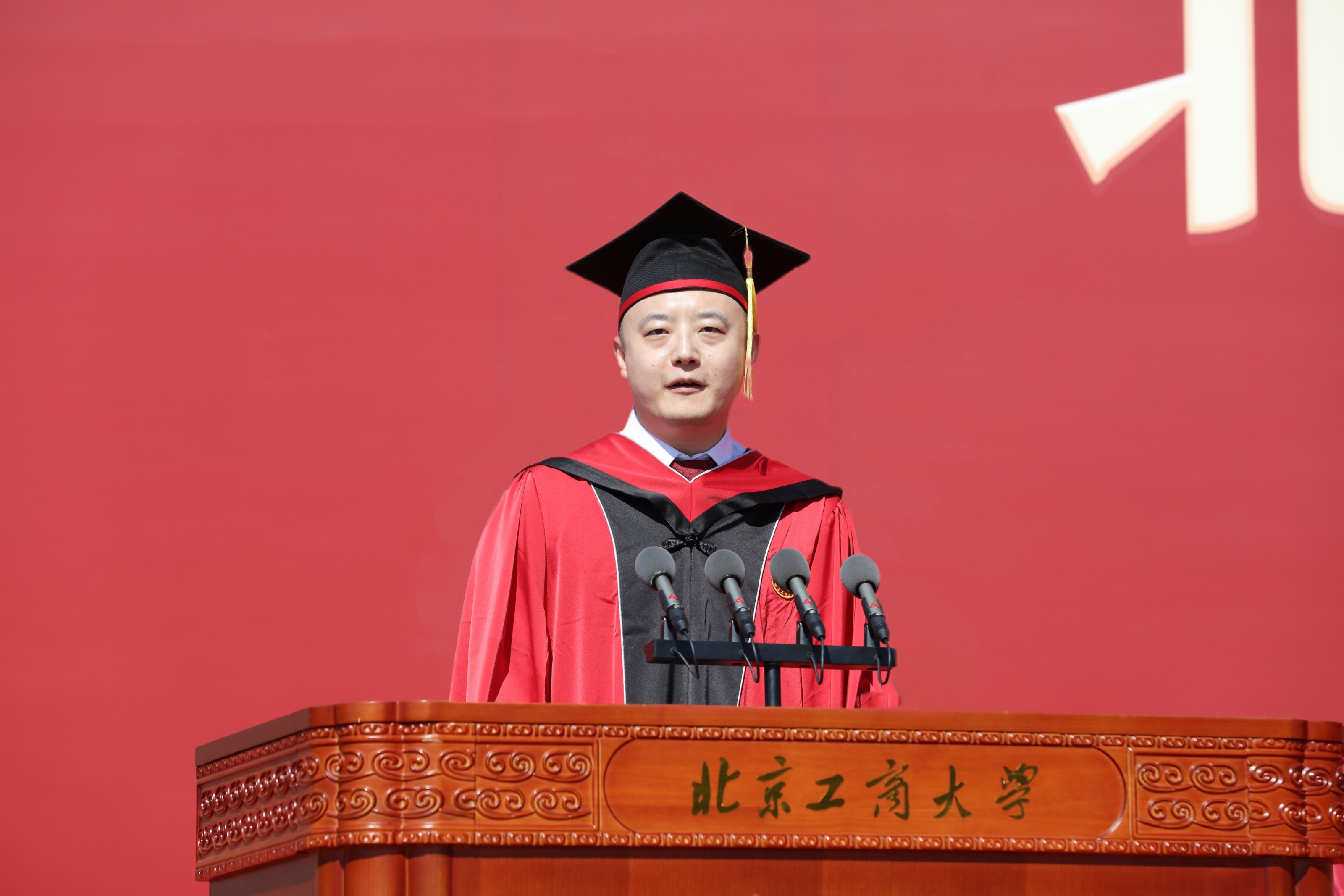 商學(xué)院副院長(zhǎng)趙川教授代表全體導(dǎo)師發(fā)言。作為北工商的畢業(yè)生,他希望每位畢業(yè)生都能懷著身為“北工商人”的底氣走向工作崗位,不管身處何處,都相信母校,以母校為榮。他將“勇于追夢(mèng),無(wú)懼蒼茫”這句話送給畢業(yè)生,祝福大家以青春為槳、與祖國(guó)共振,以夢(mèng)為馬,奔向?qū)儆谧约旱倪h(yuǎn)方。
