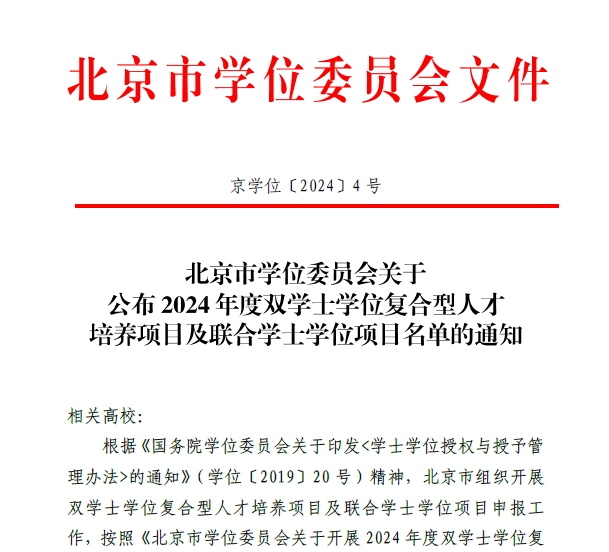近日,北京市學位委員會公布了2024年度雙學士學位復合型人才培養項目及聯合學士學位項目的審批結果,我校申報的2個雙學士學位項目全部成功獲批,實現學校本科創新人才培養模式上的突破。