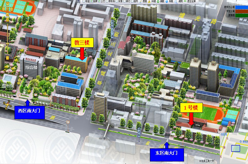 學校阜成路校區位于西三環航天橋東北角,具體地點及行車路線請登錄北京工商大學網站(www.dowbrfc.xyz)學校概況欄中“學校導游”部分;校園內樓宇分布如下圖所示或登錄“虛擬校園”查看(3dmap.btbu.edu.cn,其中東區1號樓顯示為學生公寓1)。