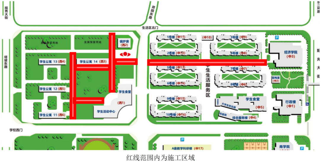 改善辦學保障條件-良鄉校區中、西區道路修繕改造項目于2024年7月22日—2024年8月15日實施。施工主要范圍為良鄉校區中、西區道路(詳細區域見示意圖)。施工內容為路面修繕、部分石材及步道磚修繕等。