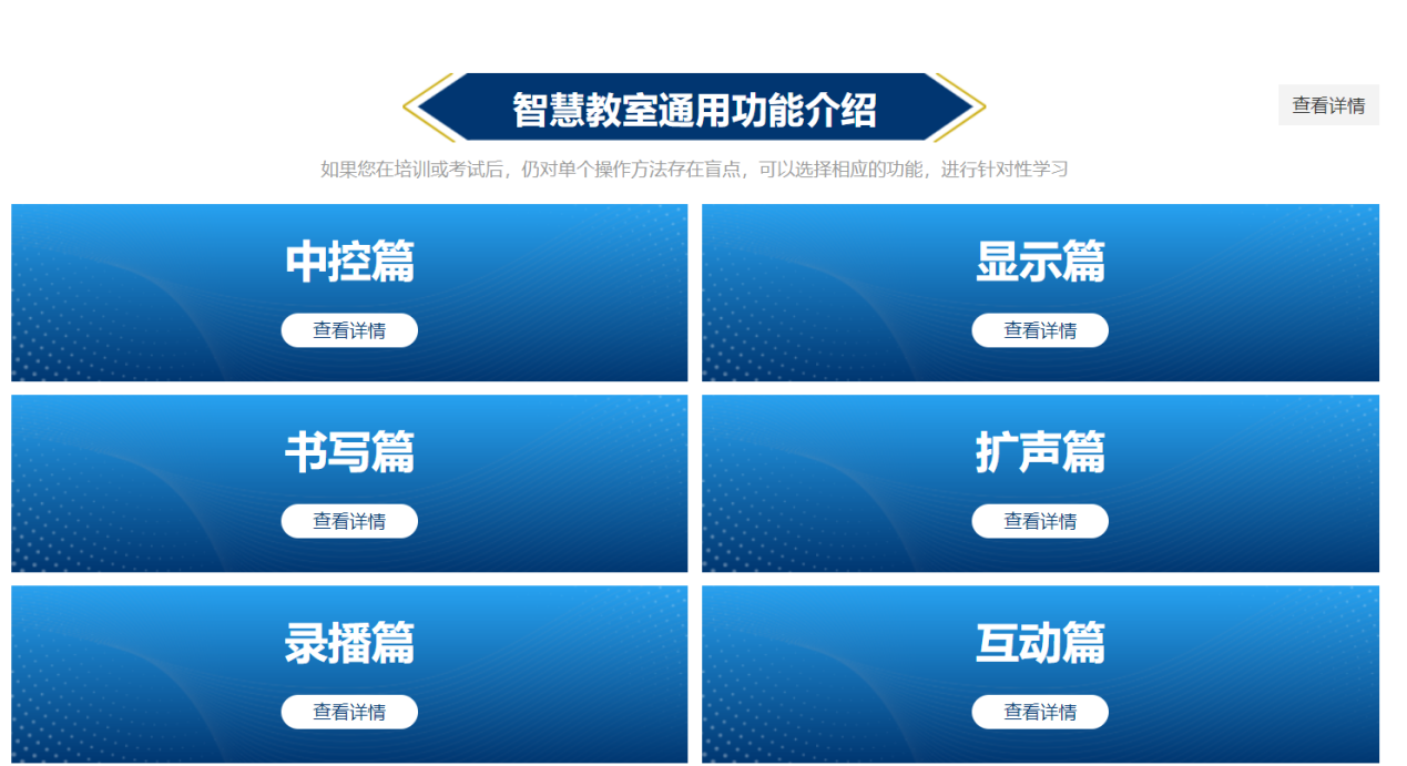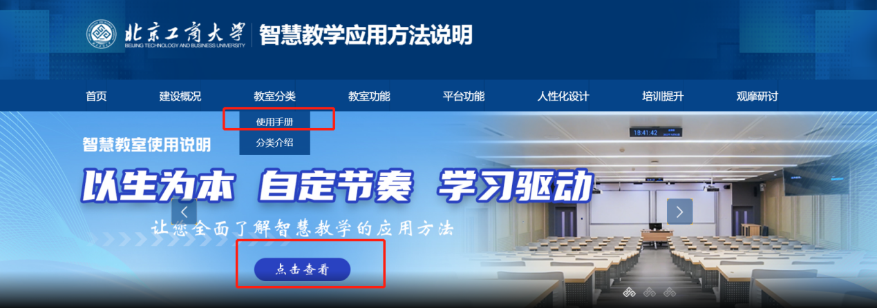 如何查看智慧教室使用手冊:1 打開教室分類,找到使用手冊,或點擊首頁“智慧教室使用說明”大圖中的“點擊查看”按鈕。