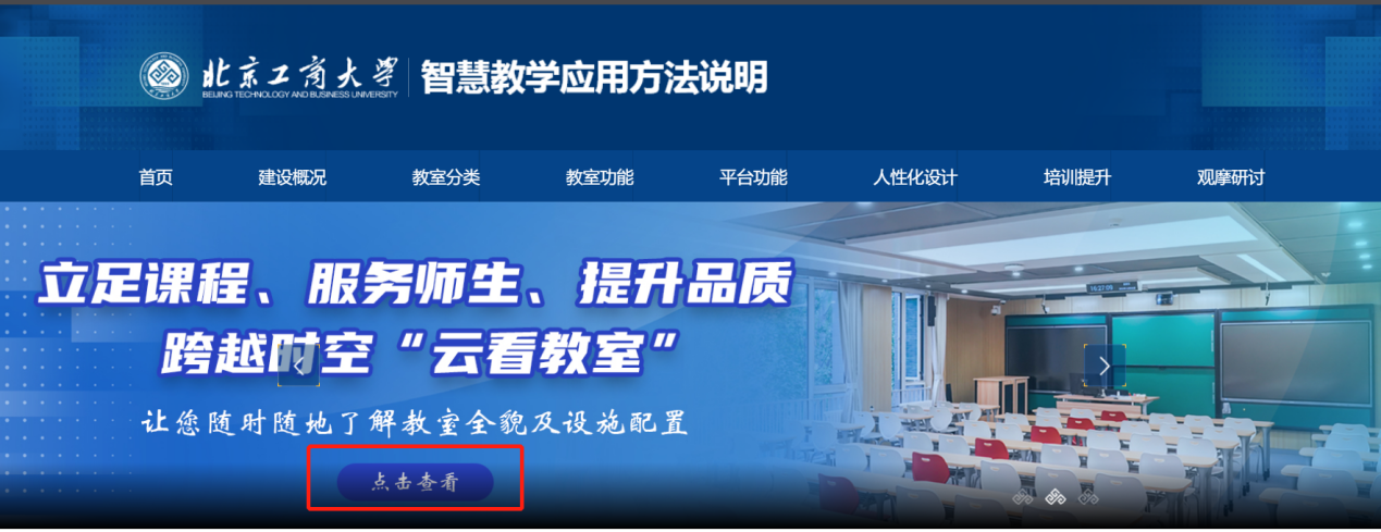 如何查看VR云看教室:點擊首頁“云看教室”大圖中的“點擊查看”按鈕。