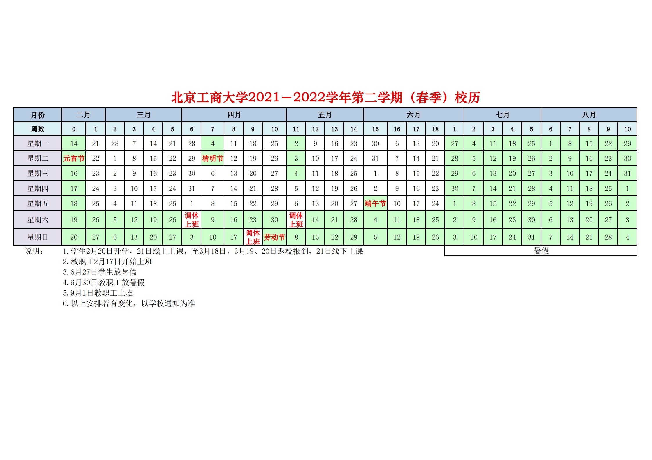 2021-2022學年第二學期(春季)校歷