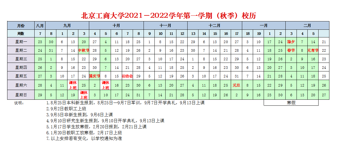 2021-2022學(xué)年第一學(xué)期(秋季)校歷