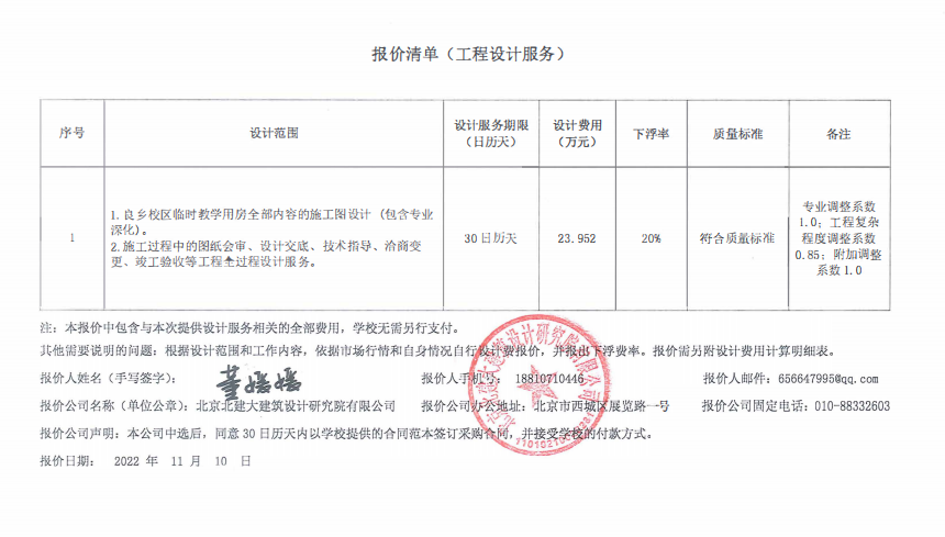 1.良鄉校區臨時教學用房全部內容的施工圖設計 (包含專業深化)。 2.施工過程中的圖紙會審、設計交底、技術指導、洽商變更、竣工驗收等工程全過程設計服務。 |