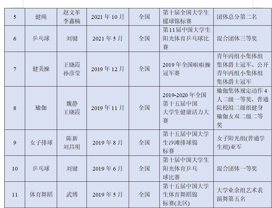 在近五年中,學校體育運動隊在市級以上比賽中取得顯著成績,有122人次取得體育類全國比賽前八名成績,2215人次取得省部級前八名成績。其中,榮獲第一名881人次、第二名406人次、第三名344人次。田徑隊、游泳隊、男子排球隊、女子排球隊參加全國普通學生組比賽,均獲得了好成績。乒乓球隊在2019年獲得第十屆中國大學生陽光體育乒乓球比賽混合團體第一的優異成績,毽球隊在2021年舉行的第十屆全國大學生毽球錦標賽中獲得團體總分第二名的優異成績,散打隊在2023年第7屆中國大學生武術散打錦標賽中取得兩金的突破性成績。這些成績不僅展示了我校體育競技的實力,也反映了校園文化的活力和學生全面發展的成果。