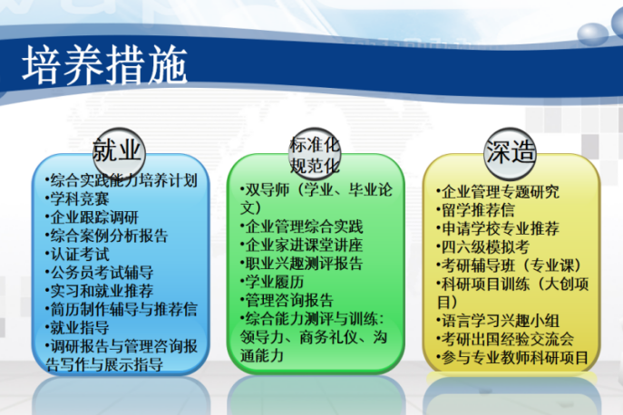 “全球管理英文教學實驗班”方向適應全球經濟一體化發(fā)展和首都“四個中心”建設的功能定位,重視對學生外語交流、科學研究和創(chuàng)新探索能力的培養(yǎng),增設全球化企業(yè)經營管理、國際貿易、英語聽說讀寫專項課程,提升學生國際化視野和跨文化管理能力,畢業(yè)生保研考研率和出國深造率較高,在外資企業(yè)和合資企業(yè)工作比重大,可從事國際投融資管理、產品進出口、跨國資本運作等工作,適應跨國公司要求畢業(yè)生能夠熟練使用英語進行交流、運用全球化思維開展工作的實際要求。